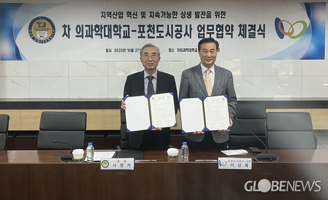 (포천 도시공사=글로브뉴스) 김승곤기자 = 포천 도시공사는 차의과학대학교(총장 서영거)와 포천도시공사(사장 이상록)가 포천시 지역사회 인재양성 및 포천시 교육발전 등을 위하여 상호 업무 협약을 27일 체결했다.