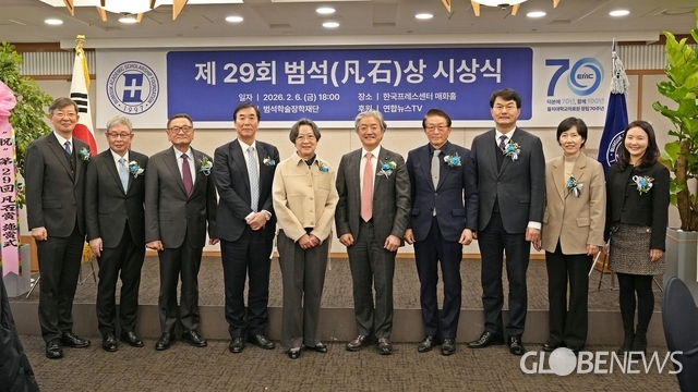 [사진 설명 : 범석학술장학재단은 지난 6일 서울 중구 한국프레스센터에서 제29회 범석상 시상식을 열었다. (왼쪽 세 번째부터) 박준영 을지재단 회장, 김승현 한양대 교수(범석 의학상), 박준숙 범석학술장학재단 이사장, 김병극 연세대 교수(범석 논문상), 임영진 범석상 심사위원장, 안수훈 연합뉴스TV 사장, 홍성희 을지대학교 총장]